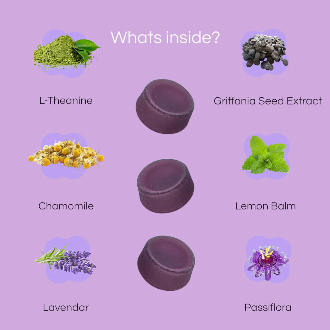 Glucose Syrup, Sucrose, Water, Griffonia Simplicifolia Seed Extract, Pectin (Gelling Agent), Citric Acid (Acidulant), Trisodium Citrate (Acidity Regulator), Coconut Oil (Glazing Agent), Passion Fruit (Flavouring), Spirulina (Natural Colour), L-Theanine (Green Tea Extract), Anthocyanins (Natural Colour), Carnauba Wax (Glazing Agent), Passiflora Incarnata Extract, Lemon Balm Extract (Laminacae