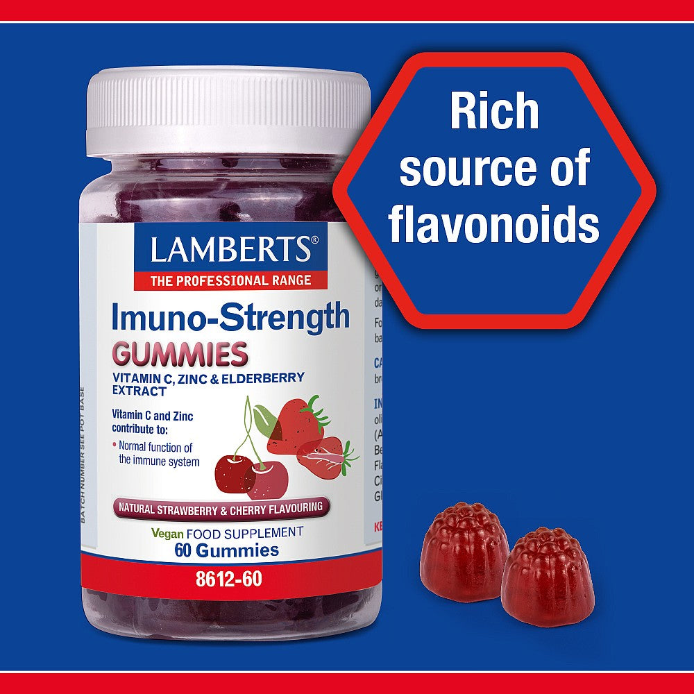 Lamberts® Imuno-Strength® Gummies combine elderberry extract with vitamin C and zinc in a naturally flavoured, sugar-free gummy. Suitable for both adults and children, they provide an easy and tasty way to supplement these key nutrients.