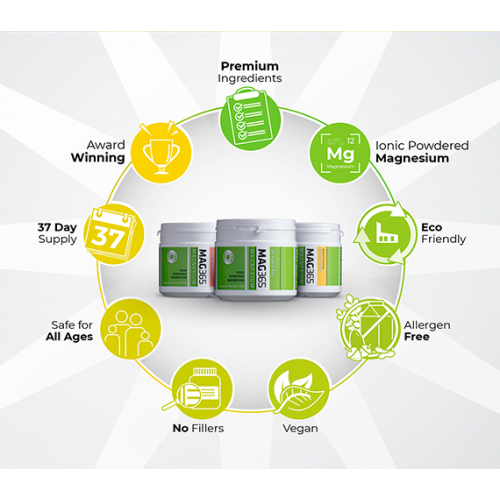 MAG365 is the flagship, multi-awarding-winning Ionic Magnesium Citrate Powder made by combining magnesium carbonate with citric acid to create a unique and bioavailable formula. MAG365 is derived from non-GMO sugar beets and sea water.