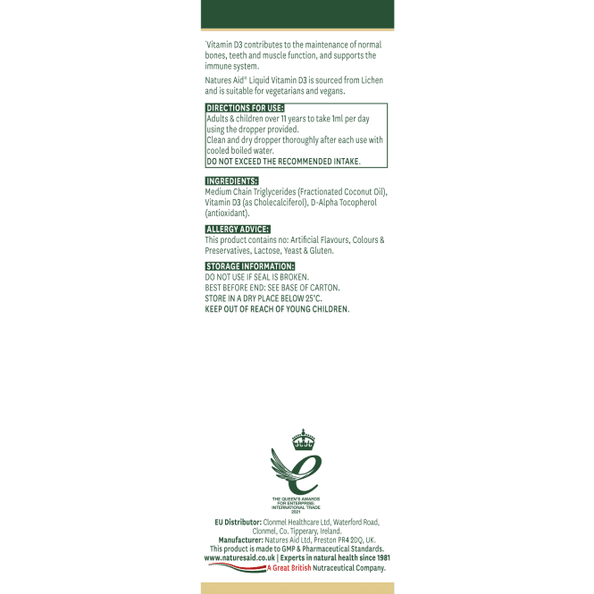 This Natures Aid Vitamin D3 2500iu liquid was created by our expert team to provide an easy to use liquid Vitamin D supplement, which is suitable for vegans. Each 1ml dose can be taken directly or can easily be added to food or drink.  Most Vitamin D supplements are sourced from sheep wool; however, our natural Vitamin D Oil is sourced from Lichen, and is certified vegan friendly.