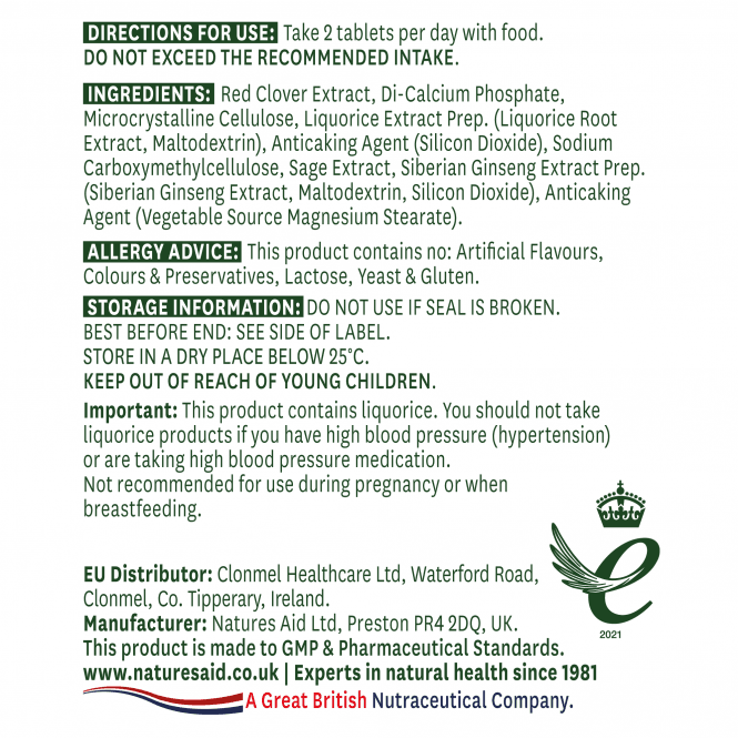 Red Clover Extract, Di-Calcium Phosphate, Microcrystalline Cellulose, Liquorice Extract Prep. (Liquorice Root Extract, Maltodextrin), Anticaking Agent (Silicon Dioxide), Sodium Carboxymethylcellulose, Sage Extract, Siberian Ginseng Extract Prep. (Siberian Ginseng Extract, Maltodextrin, Silicon Dioxide), Anticaking Agent (Vegetable Source Magnesium Stearate).