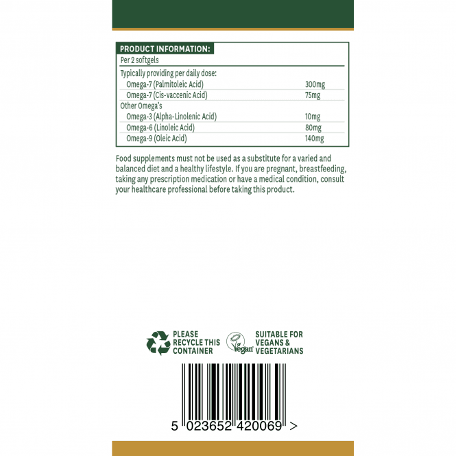 We've harnessed this fruit to create our fuss-free, easy-to-swallow Sea Buckthorn Oil 500mg softgels, and every daily serving provides 375mg of Omega-7 (Palmitoleic Acid).