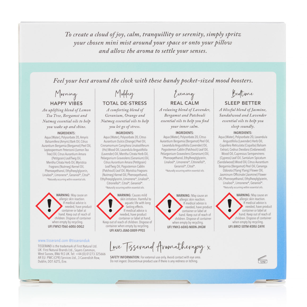 To create a cloud of joy, calm, tranquillity or serenity, simply spritz your chosen mini mist around your space or onto your pillow and allow the aroma to settle your senses.