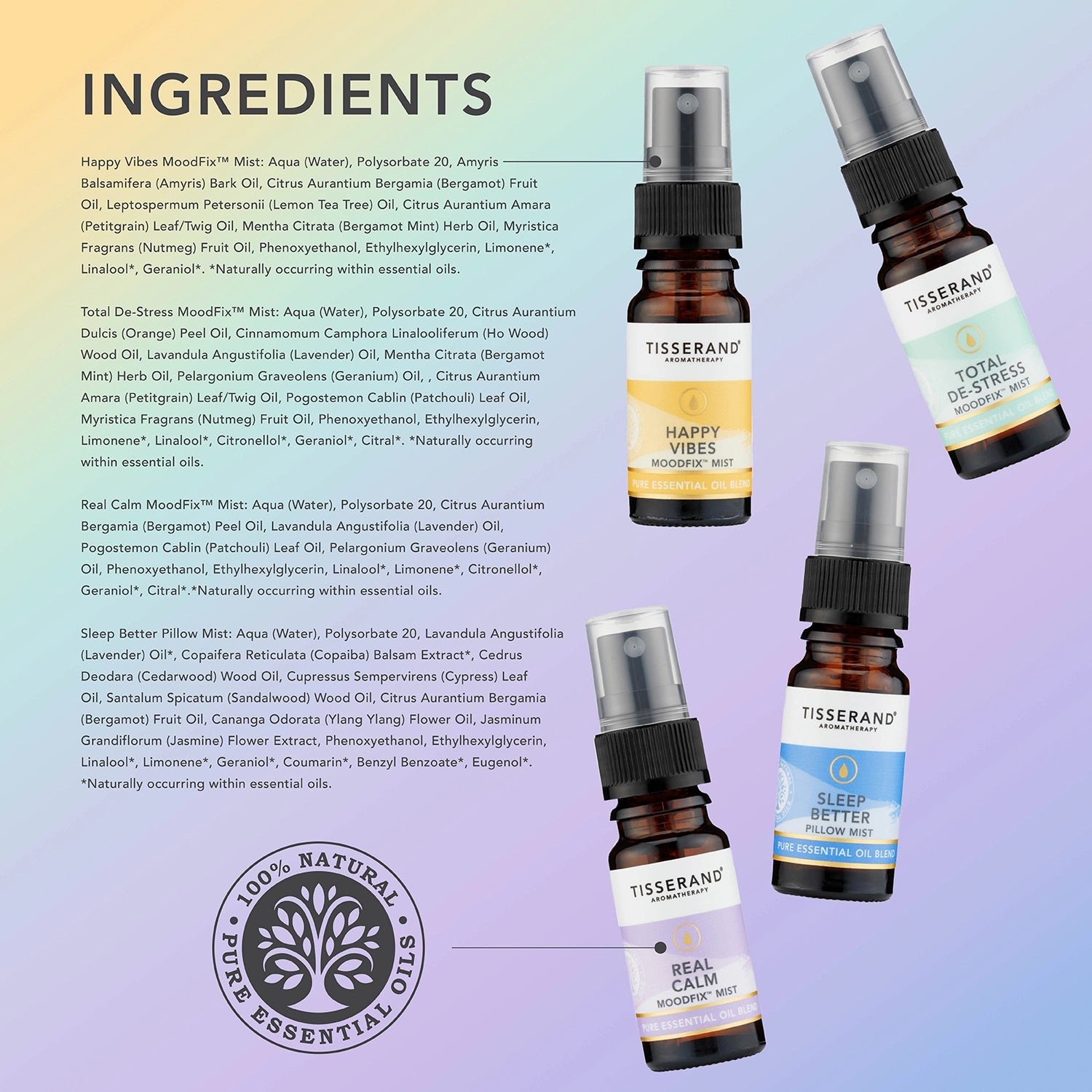 Total De-Stress MoodFix™ Mist: Water, Polysorbate 20, Orange Peel, Ho Wood, Lavender, Bergamot Mint, Geranium, Petitgrain Leaf/Twig, Patchouli Leaf, Nutmeg Kernel, Phenoxyethanol, Ethylhexylglycerin, Limonene*, Linalool*, Citronellol*, Citral*, Geraniol*.