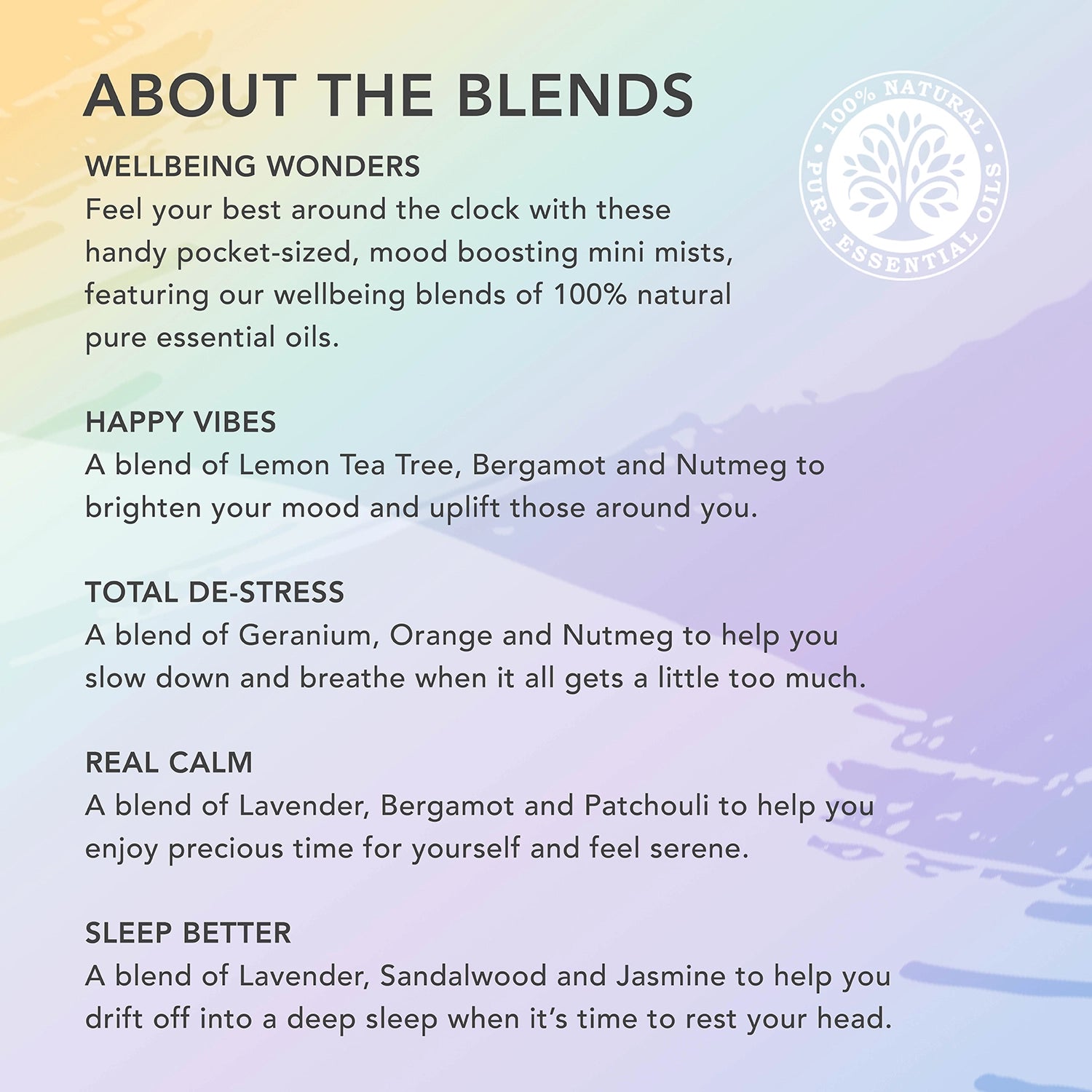 Feel your best around the clock with these handy pocket-sized mood boosters, featuring our Happy Vibes, Total De-Stress, Real Calm and Sleep Better wellbeing blends of 100% natural pure essential oils.