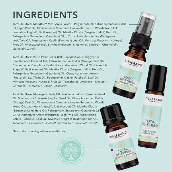 Total De-Stress Massage & Body Oil: Sesamum Indicum (Sesame) Seed Oil, Simmondsia Chinensis (Jojoba) Seed Oil, Citrus Aurantium Dulcis (Orange) Peel Oil, Cinnamomum Camphora Linalooliferum (Ho Wood) Wood Oil, Lavandula Angustifolia (Lavender) Oil, Mentha Citrata (Bergamot Mint) Herb Oil, Pelargonium Graveolens (Geranium) Oil, Citrus Aurantium Amara (Petitgrain) Leaf/Twig Oil, Pogostemon Cablin (Patchouli) Leaf Oil, Myristica Fragrans (Nutmeg) Fruit Oil, Tocopherol, Limonene*, Linalool*, Citronellol*, Citral*, Geraniol*. *Naturally occurring within essential oils.
