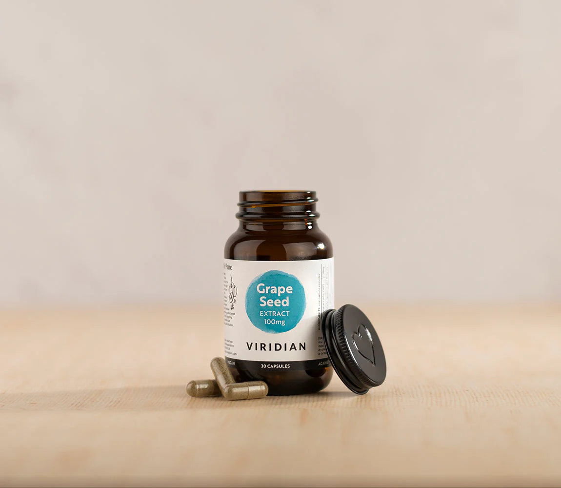 Viridian’s Grape Seed (Vitis vinifera L.) Extract is a source of natural polyphenols and oligomeric proanthocyanidins (OPCs). These OPCs are plant-based flavanoid compounds that are found in the seeds of red grapes. Standardised to 95% OPCs, grape seed extract is an ideal source of beneficial bioflavonoids.
